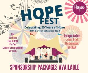 We are celebrating ’50 Year’s of Hope’ at Hope Fest! It’s a two day extravaganza held in the grounds of the historic Delapre Abbey. Hope Fest is one of our key events taking place in our 50th year where we will be inviting everyone to join us across Northamptonshire to celebrate with us. We are showcasing a line-up of attractions with live music from local bands, DJs, a food and drinks fair, a children’s fun fair and more.