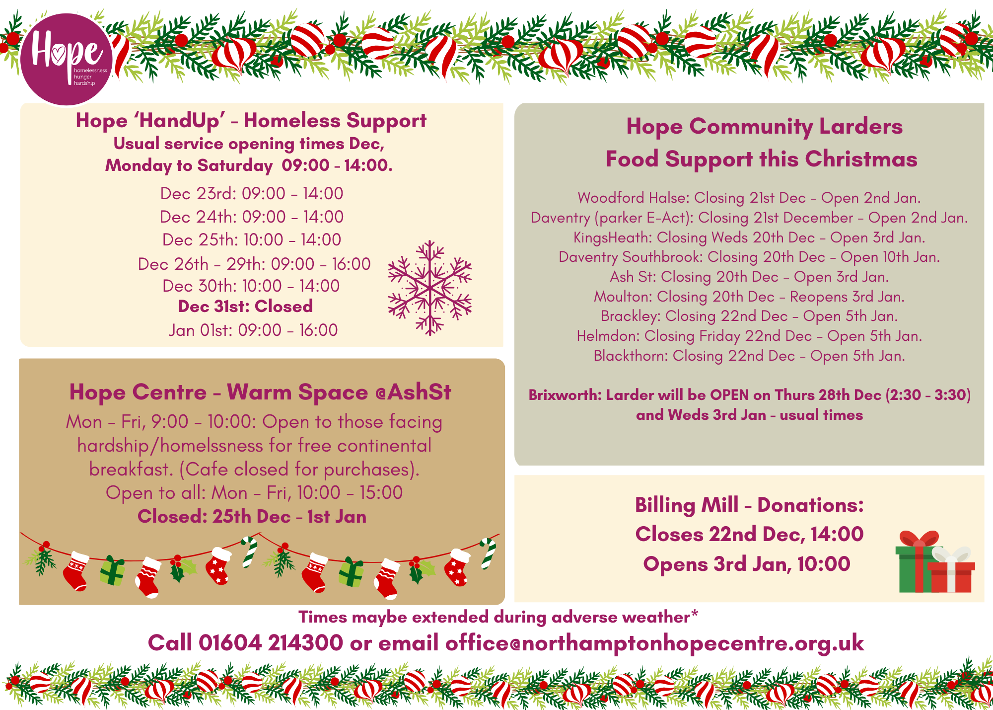 Hope needs all kinds of things to help those who are hungry and those who are homeless through the challenging months ahead. Please see details of how you can help.