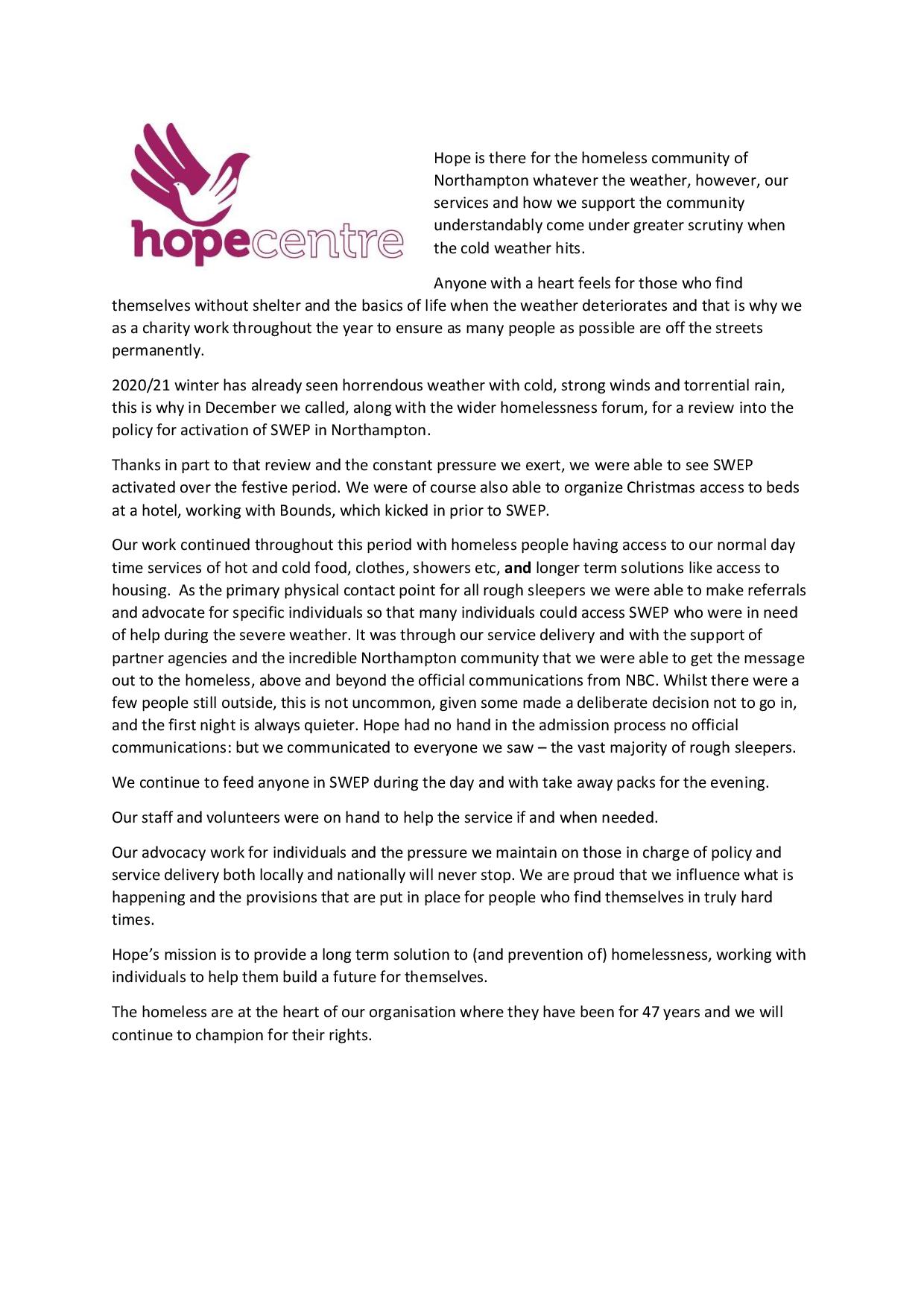 Our work continued throughout this period with homeless people having access to our normal day time services of hot and cold food, clothes, showers etc, and longer term solutions like access to housing. As the primary physical contact point for all rough sleepers we were able to make referrals and advocate for specific individuals so that many individuals could access SWEP who were in need of help during the severe weather. It was through our service delivery and with the support of partner agencies and the incredible Northampton community that we were able to get the message out to the homeless, above and beyond the official communications from NBC. Whilst there were a few people still outside, this is not uncommon, given some made a deliberate decision not to use the service. Hope had no hand in the admission process nor official communications: but we communicated to everyone we saw – the vast majority of rough sleepers.