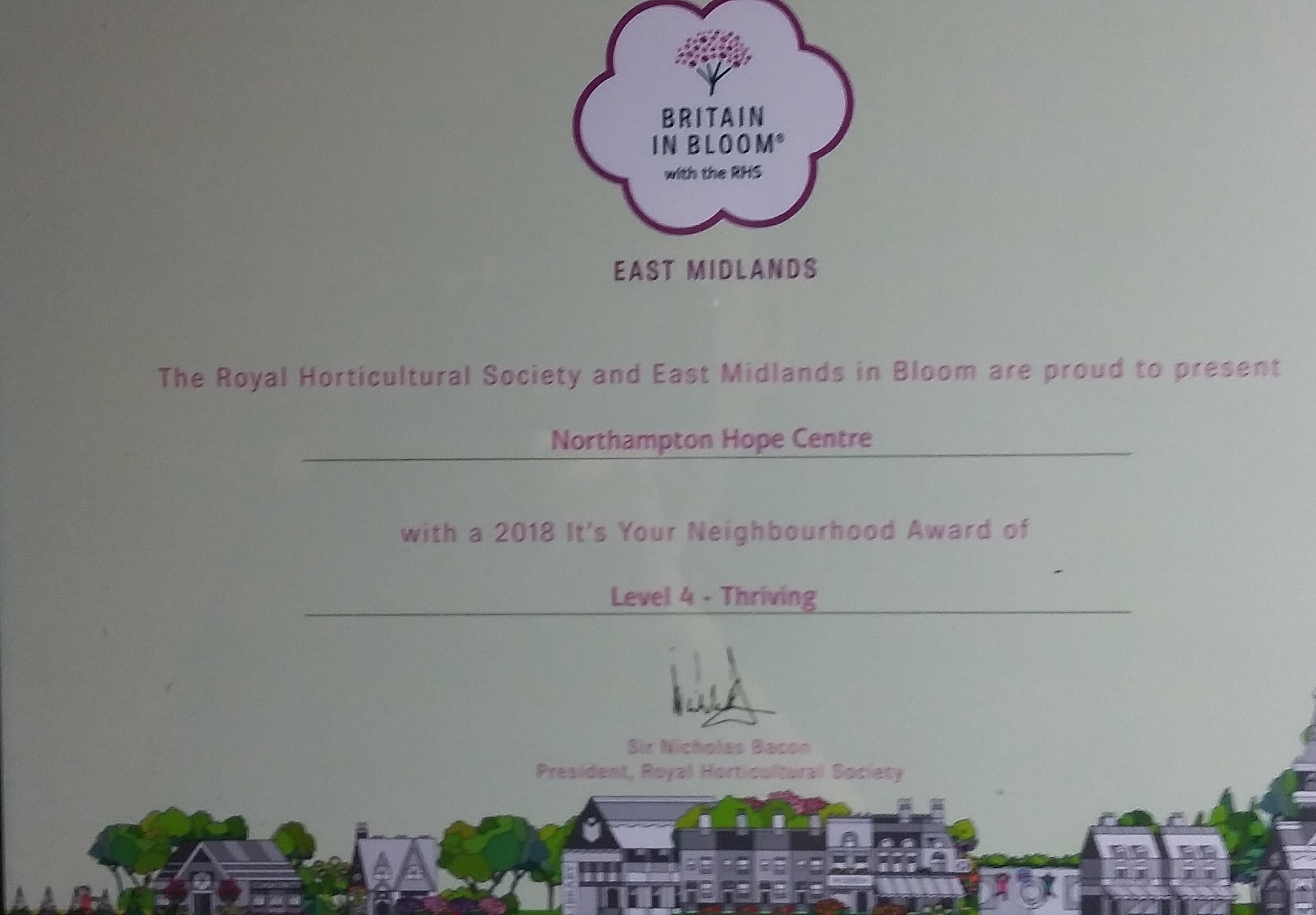 Hope wins three RHS (Royal Horticultural Society) awards last night in Northampton and East Midlands in Bloom: Gold (with Oasis partnership) for the therapeutic garden for service users at the day centre, for Northampton; a ‘thriving‘ (80% mark) award as part of the overall Gold, as Hope itself, for Northampton’s entry in East Midlands in Bloom; and a Silver, in our first year, for the new allotment gardening project. We are thrilled!