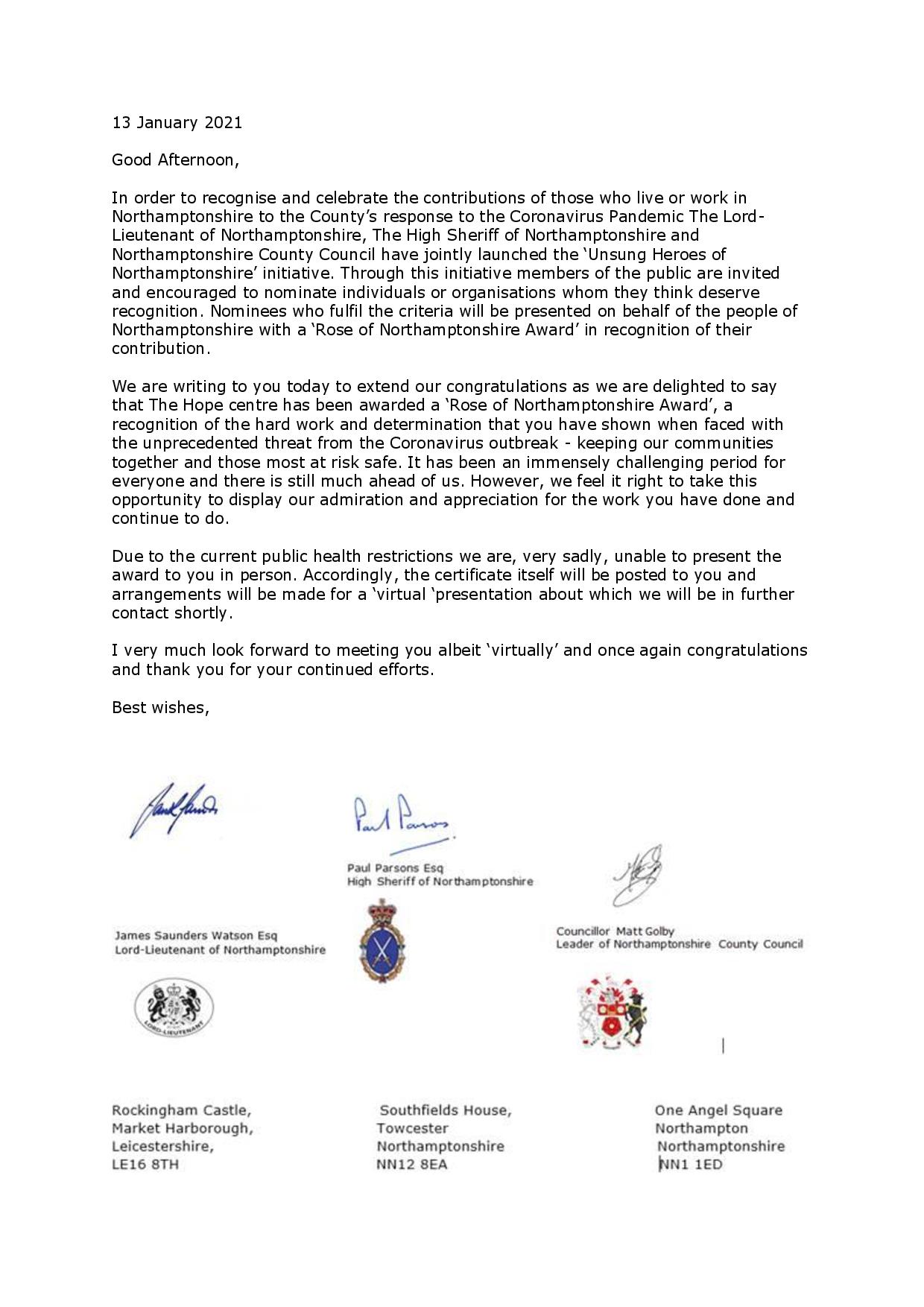 The Northampton Hope Centre are delighted to announce that in recognition and celebration of our response to the Coronavirus Pandemic the Lord-Lieutenant of Northamptonshire, The High Sheriff of Northamptonshire and Northamptonshire County Council have jointly awarded us the Rose of Northampton.