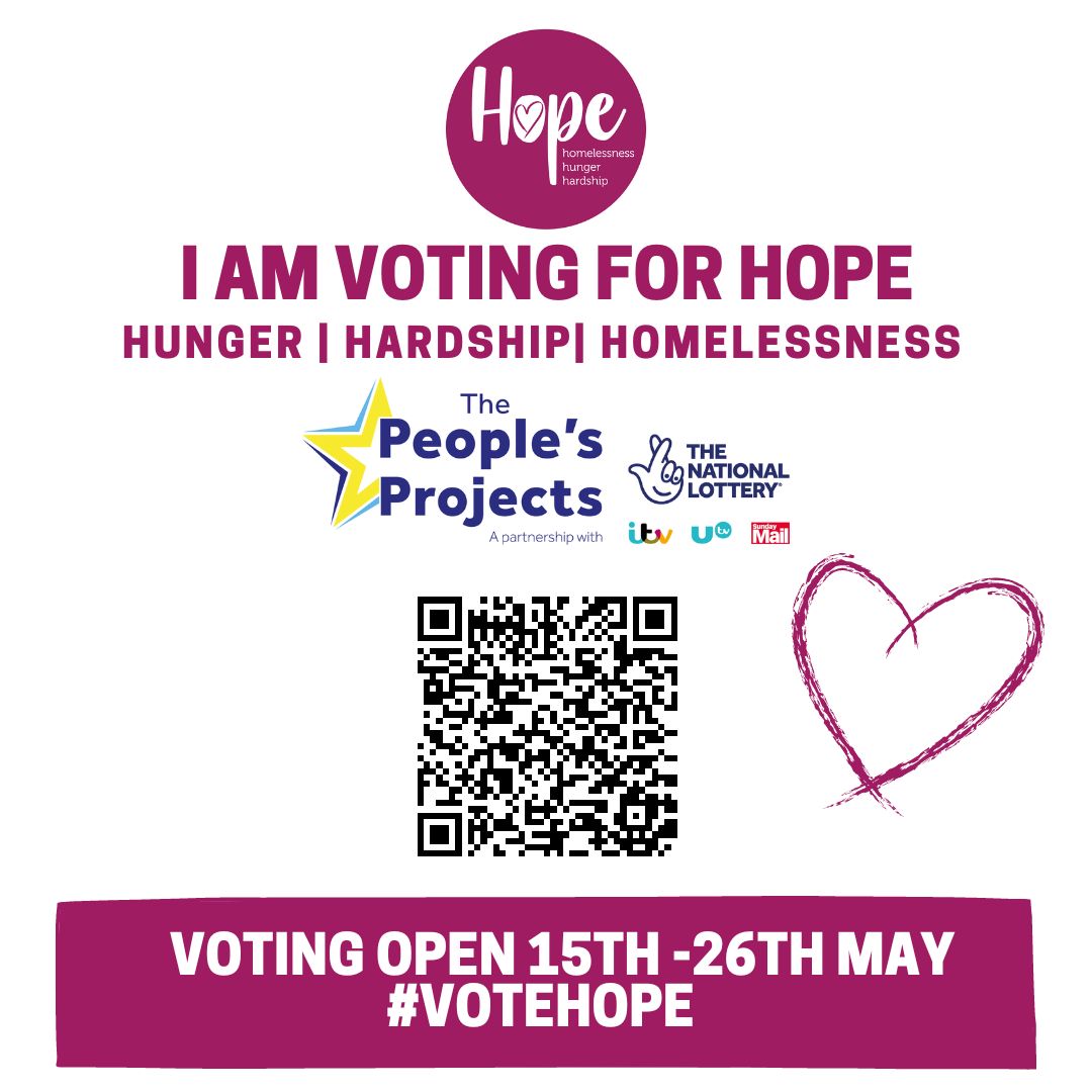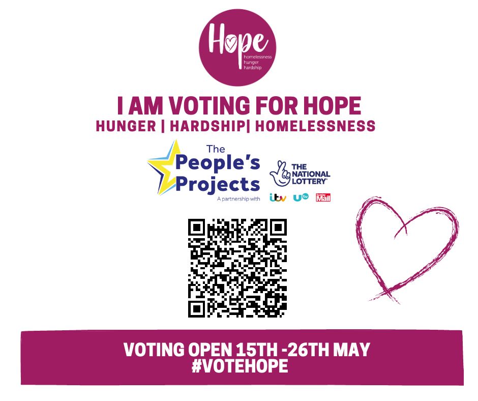 Every vote will count so ask family members, friends, work colleagues and neighbours to support Hope so we can continue to do the vital work we do in the community. Supporting those facing hardship, hunger and homelessness.